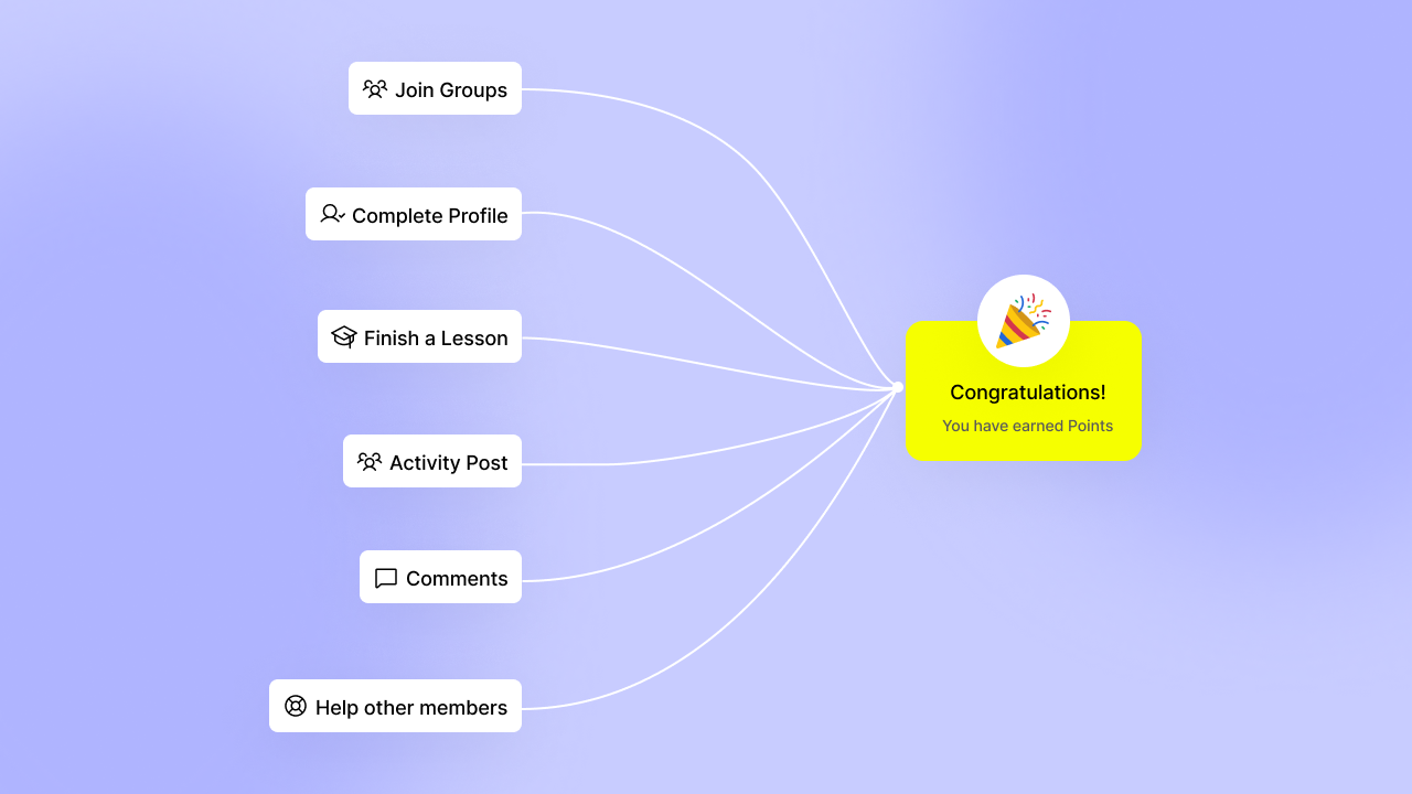 Points act as behavioral currency. Members earn points for actions you want to encourage. Create multiple point types to separate different engagement categories. You might create “Community” points for social activity, “Learning” points for course progress, “Contribution” points for helping other members. Each type could track different types of behaviors and serve a different strategic purposes.