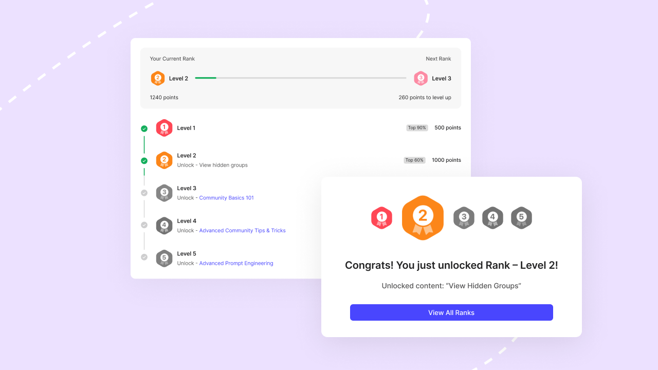 Create onboarding achievements that guide new members through your platform. Use ranks to unlock premium content. Members at your base rank get free resources. Higher ranks unlock your premium library, exclusive groups, or advanced courses.