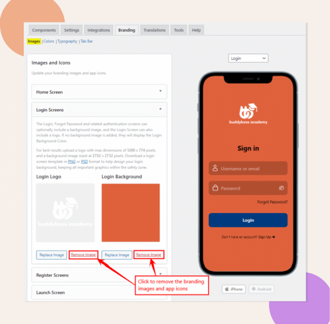 - Click Remove Image for every section: Home Screen, Login Screen, Register Screen, Launch Screen, App Icons, Android Adaptive Icon, and Android Notification Icon.