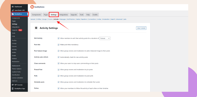 - In your WordPress Dashboard, go to BuddyBoss > Settings > Activity.