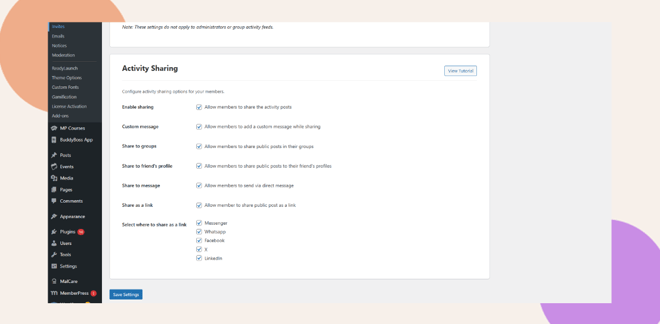 Once activated, you can configure the sharing options from your BuddyBoss settings.