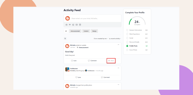 Once enabled, members will see a Share button next to the Like and Comment buttons on each activity post.
