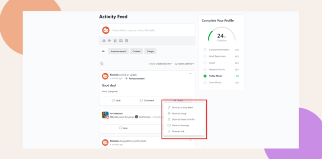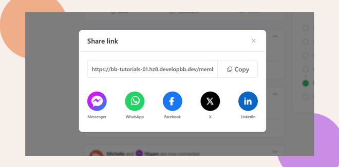 With this feature, members can share activity posts to their own feeds, groups, friends’ profiles, or private messages and even generate a shareable link for external sharing. This helps boost engagement and makes your community’s best content easier to share and discover.