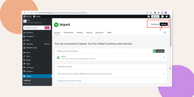 - In your WordPress dashboard, go to Jetpack > Dashboard, then click Settings (top right).