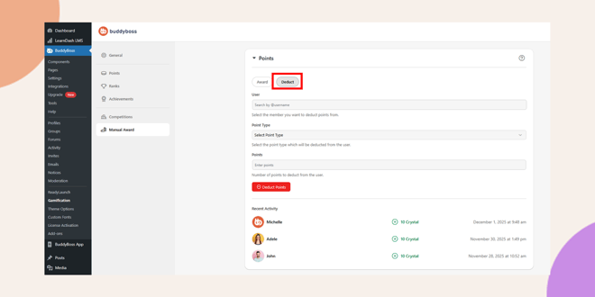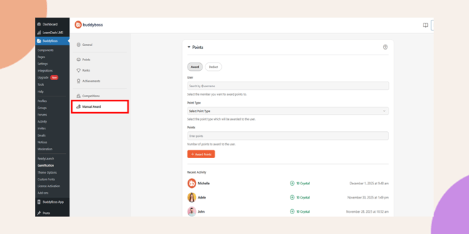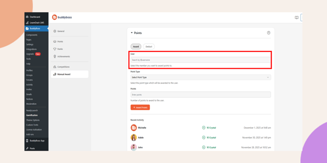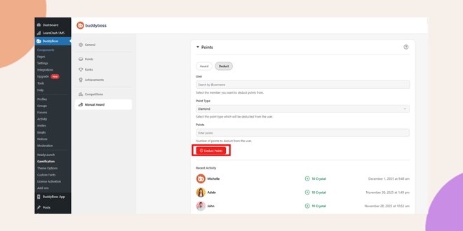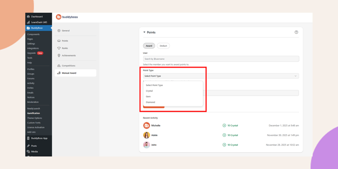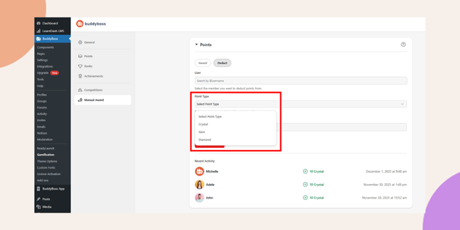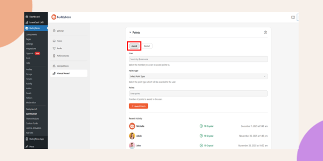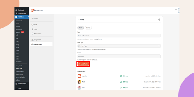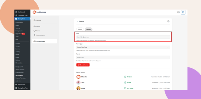 This guide walks you through how to manually award and deduct BuddyBoss gamification points directly from your WordPress dashboard.