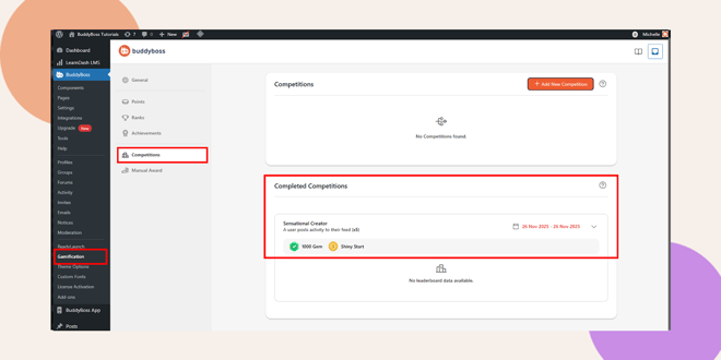- Navigate to BuddyBoss > Gamification > Competitions.