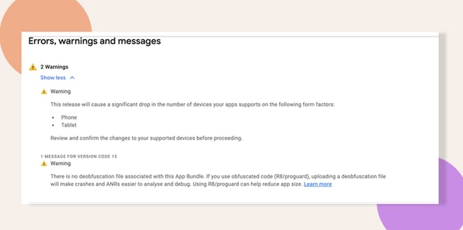 When submitting your app to Google Play Console, you may encounter a yellow warning that reads