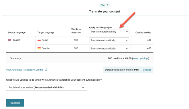 In “What would you like to do when WPML finishes translating your content automatically?”, select a review option. If you’re using PTC, you can choose to publish without review. Then click Translate.