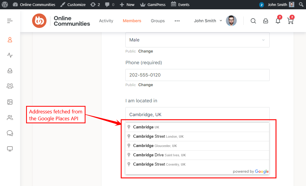 The integration automatically starts filling the location field when you start typing in it. The integration works and requires the BuddyBoss Platform installed and activated on your website. The BuddyBoss Theme blends any location field on the profile page seamlessly.