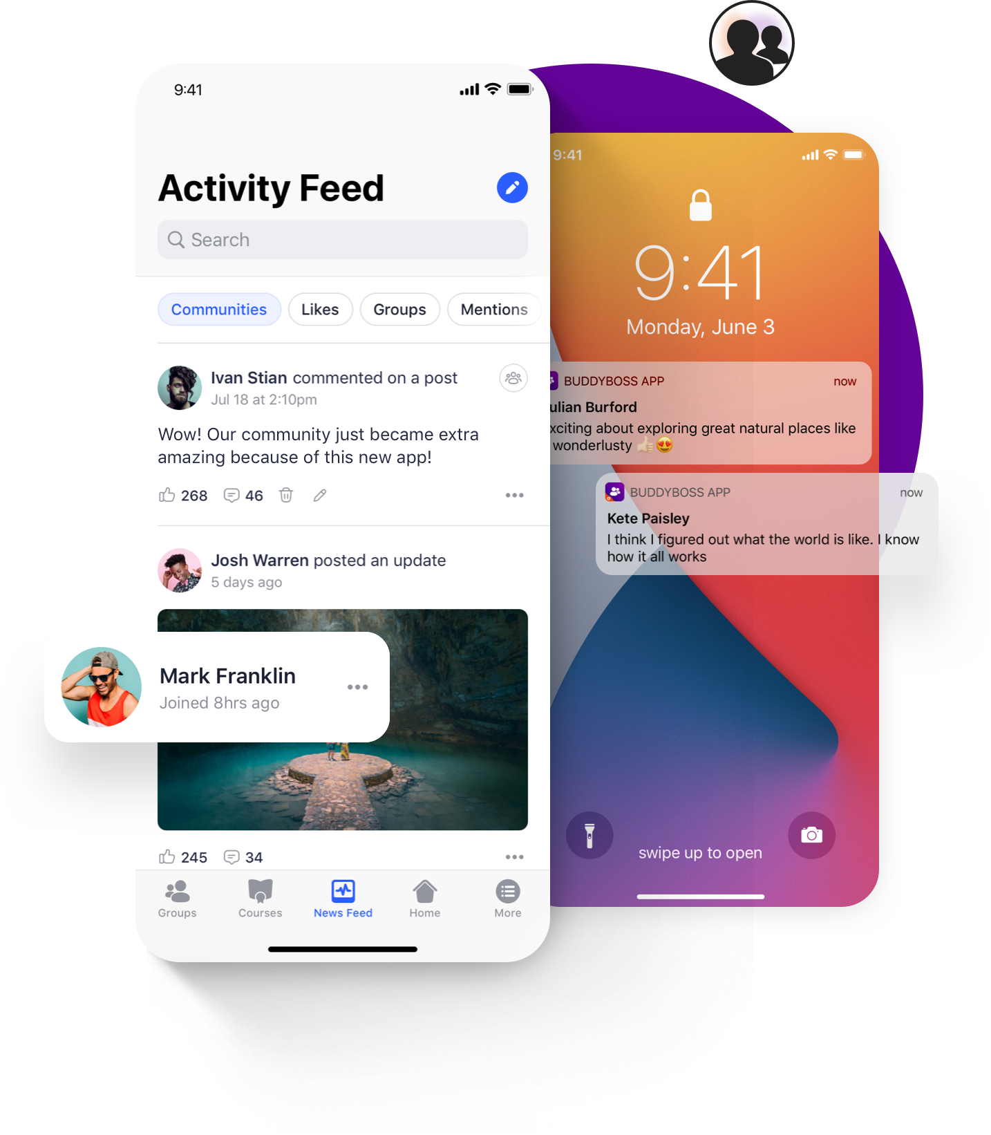 Add members to public, private or hidden groups. Allow members to create groups and invite friends. Host virtual classes, meetings and events inside your groups.