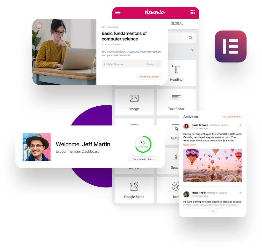 Add custom Elementor widgets that let students quickly view important information about their courses and activities.