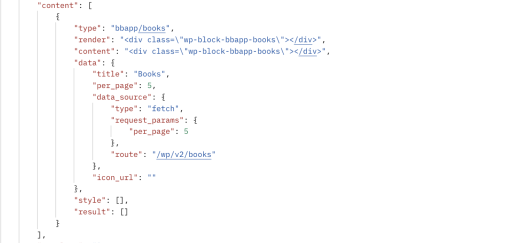 You can assemble the two PHP template files below into a folder, to create a plugin that will add a new “Books” block, which can be viewed when editing an App Page or using the App Editor.