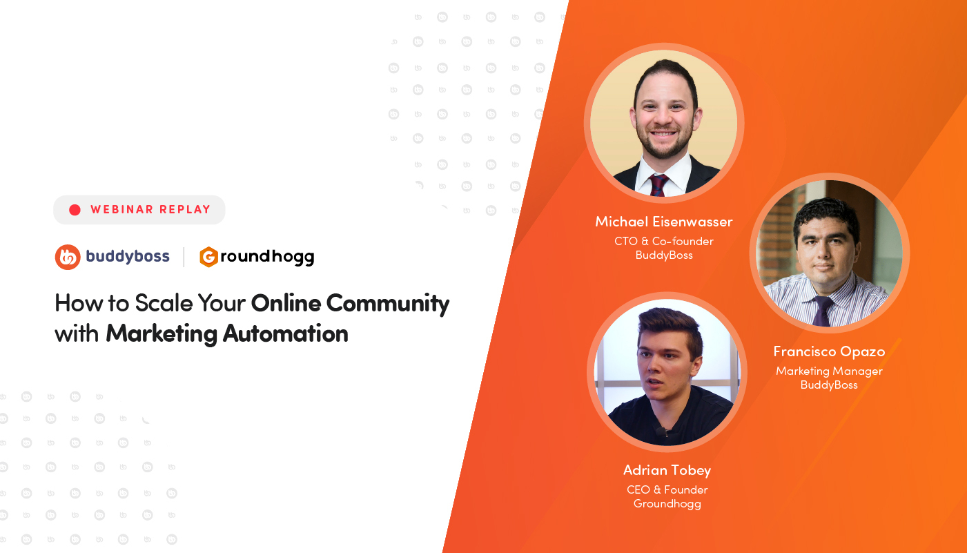 Growing and engaging your online community isn’t as hard when you have scalable automation processes in place. In this webinar, hear from Michael Eissenwasser, co-founder and CTO of BuddyBoss and Adrian Tobey, CEO of Groundhogg as they share insights of how the integration can help you increase leads and sales for your membership, community, and online courses website.