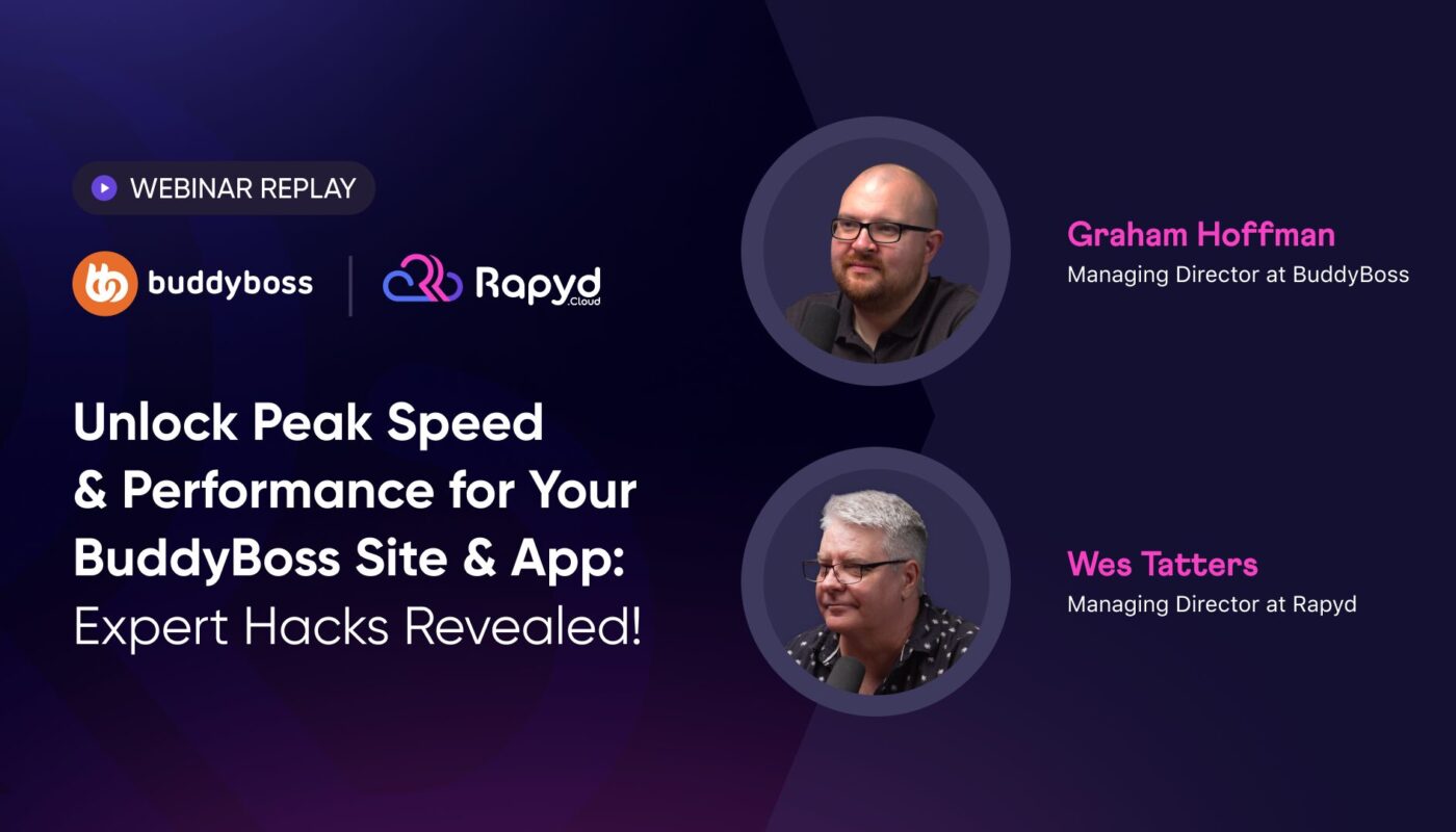 Join BuddyBoss Managing Director Graham Hoffman and Rapyd Managing Director Wes Tatters as they share their expert knowledge and reveal the actionable hacks that will transform your BuddyBoss site and app into speedy ventures.