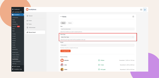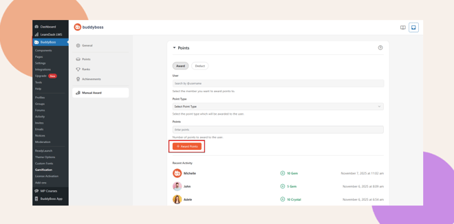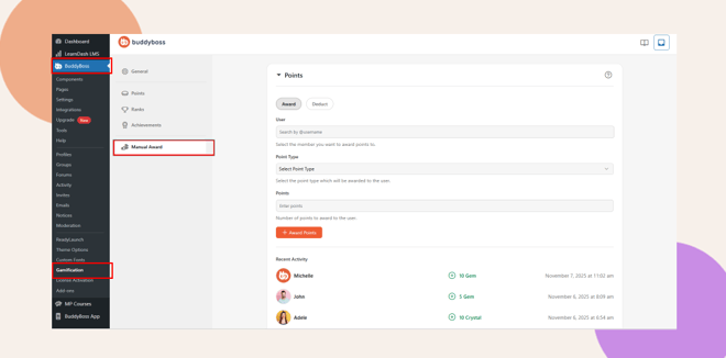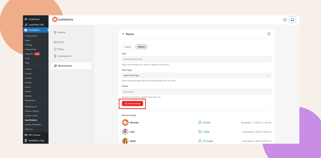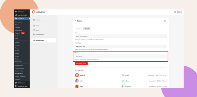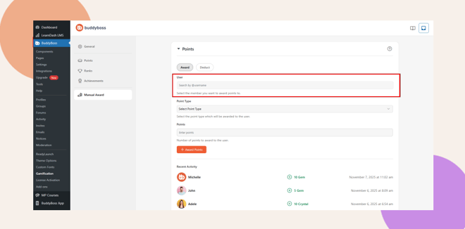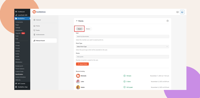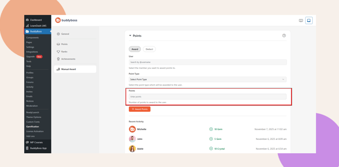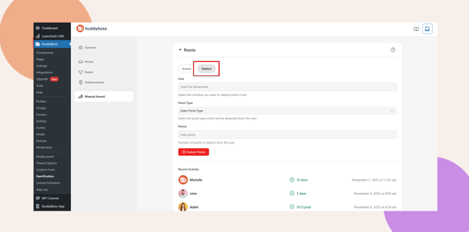 This guide walks you through how to manually award and deduct BuddyBoss gamification points directly from your WordPress dashboard.