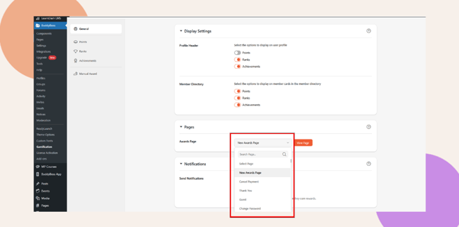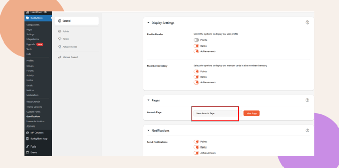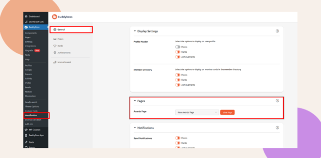 - Return to BuddyBoss > Gamification > General > Pages.