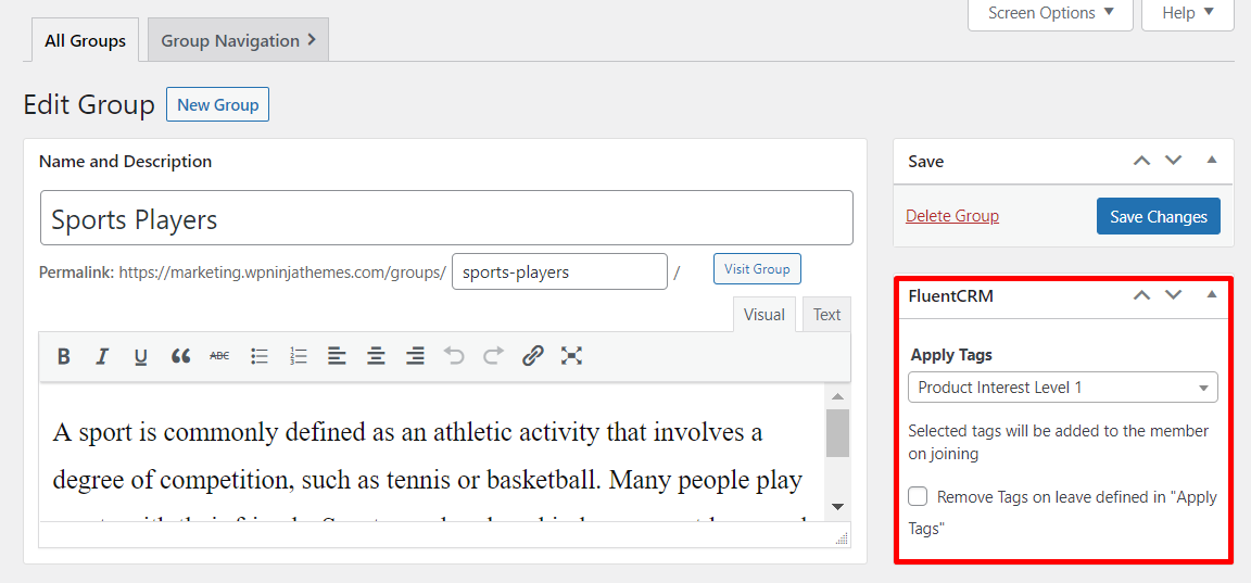 - Apply or remove tags in FluentCRM when people join a profile type or group