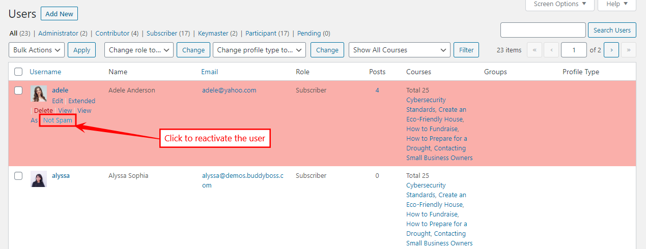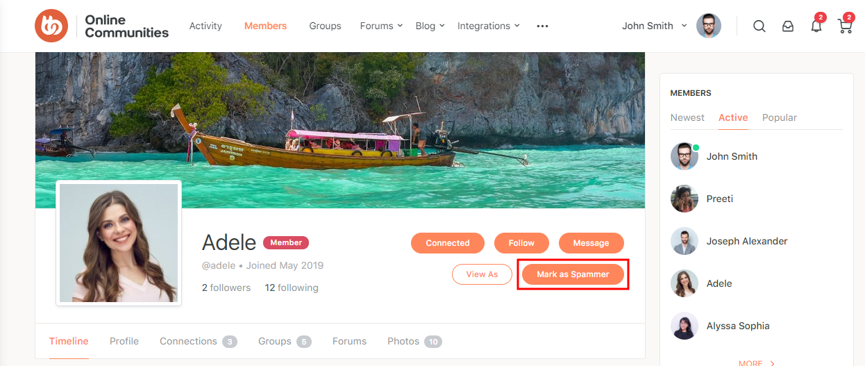 The One Click Mark Spammer plugin lets site administrators mark users as a spammer with a single click from the Members Directory, a user’s profile or BuddyPress group members list.