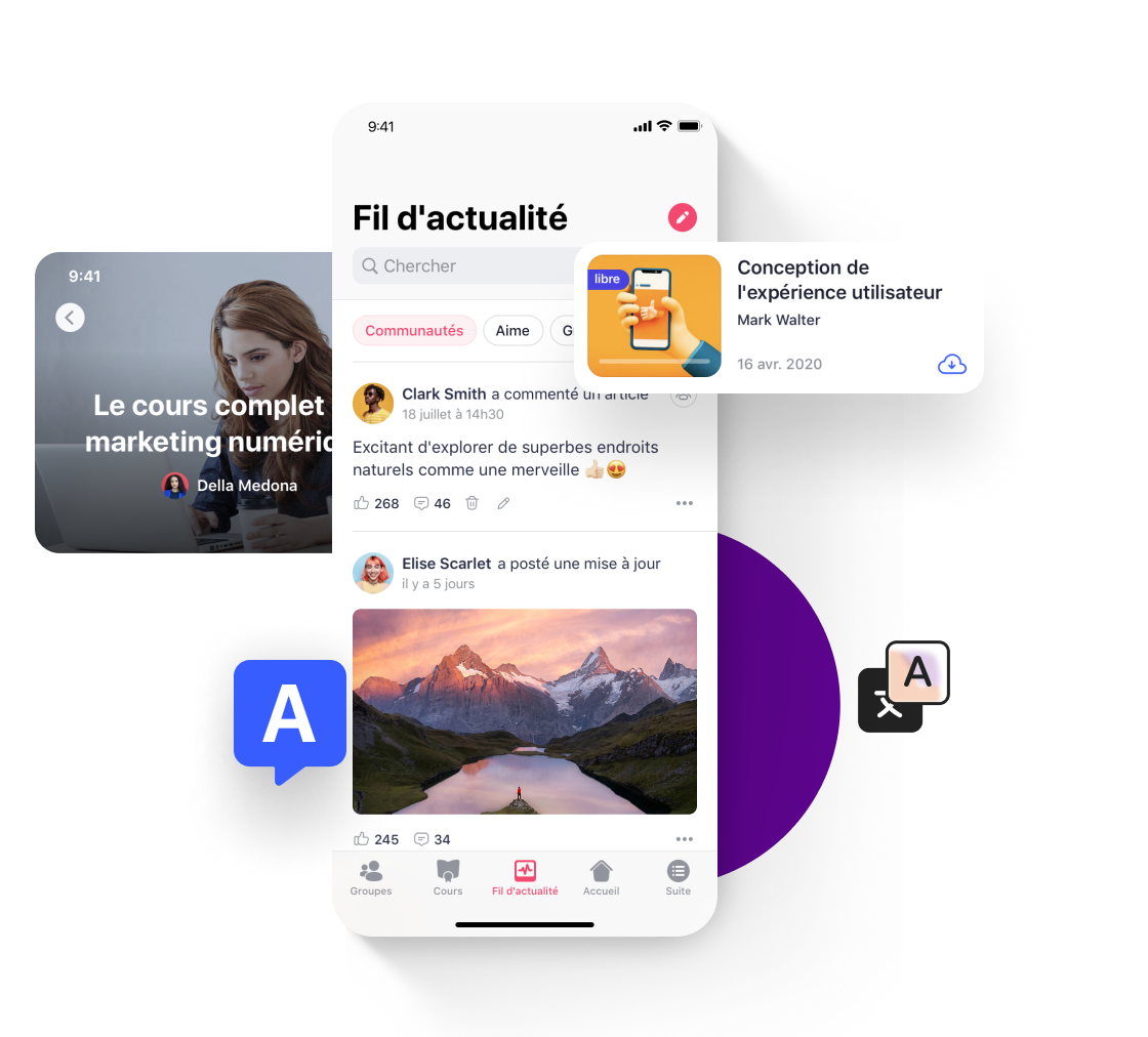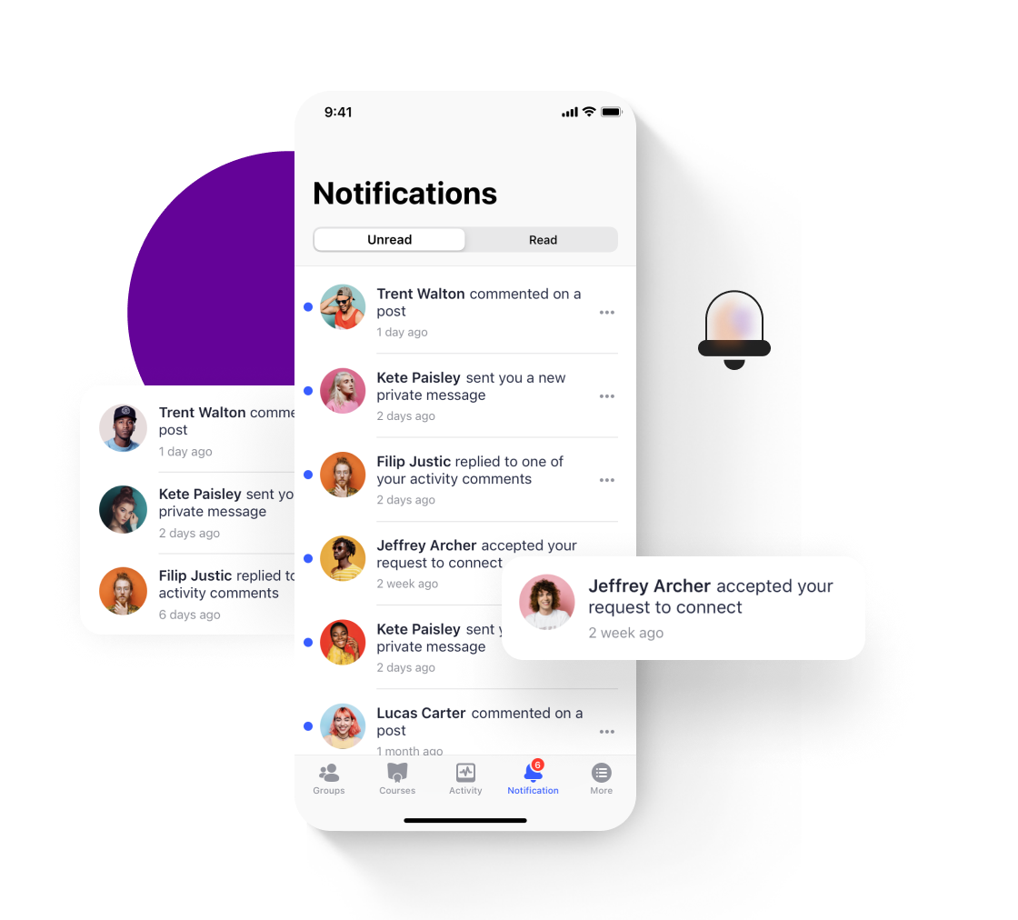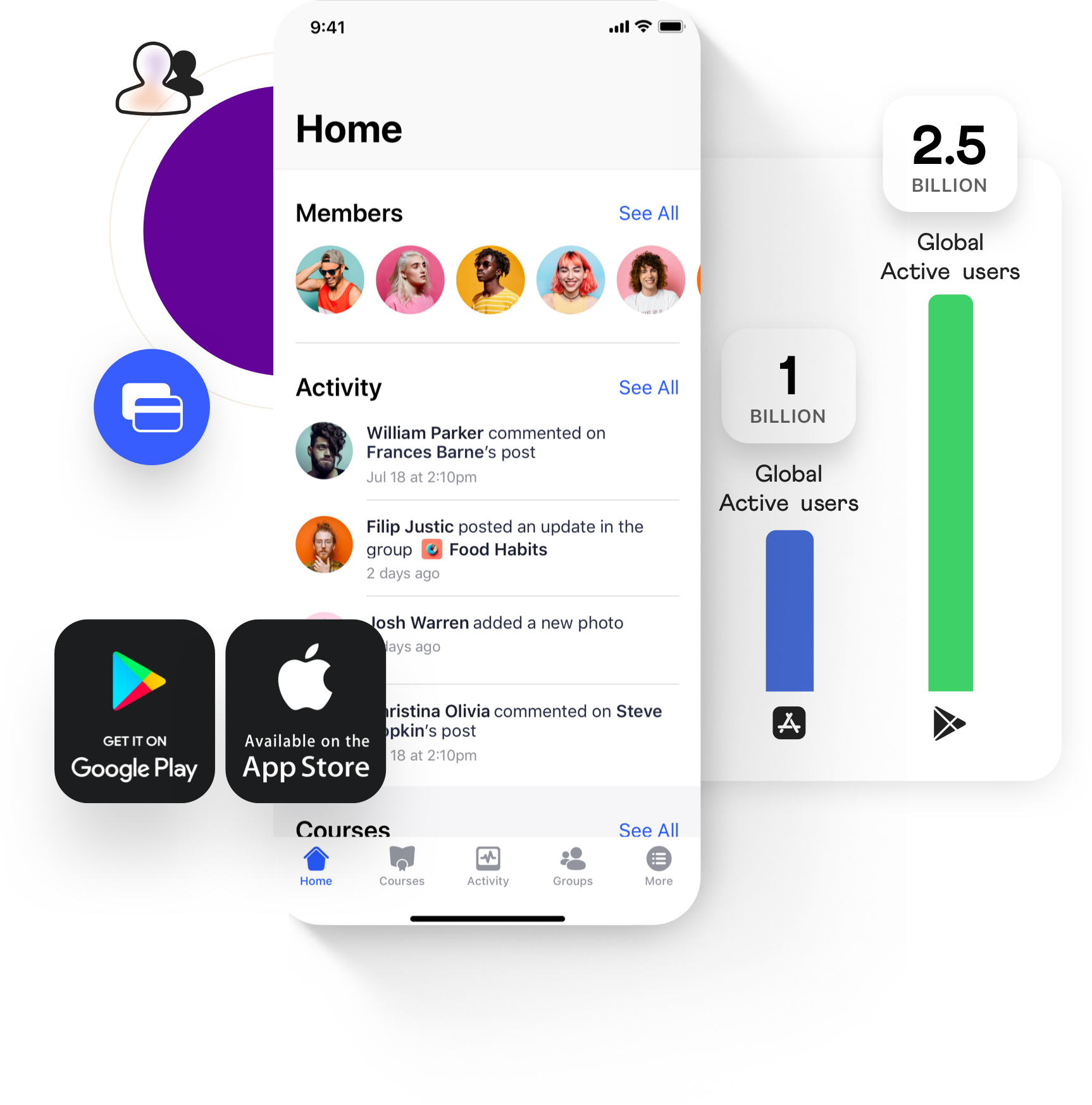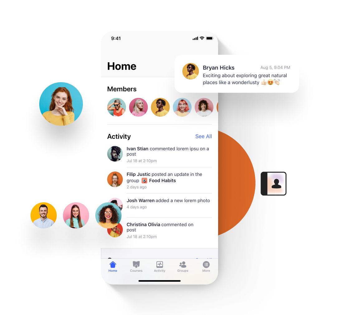 Add members to public, private or hidden groups. Allow members to create groups and invite friends. Host virtual classes, meetings and events inside your groups.