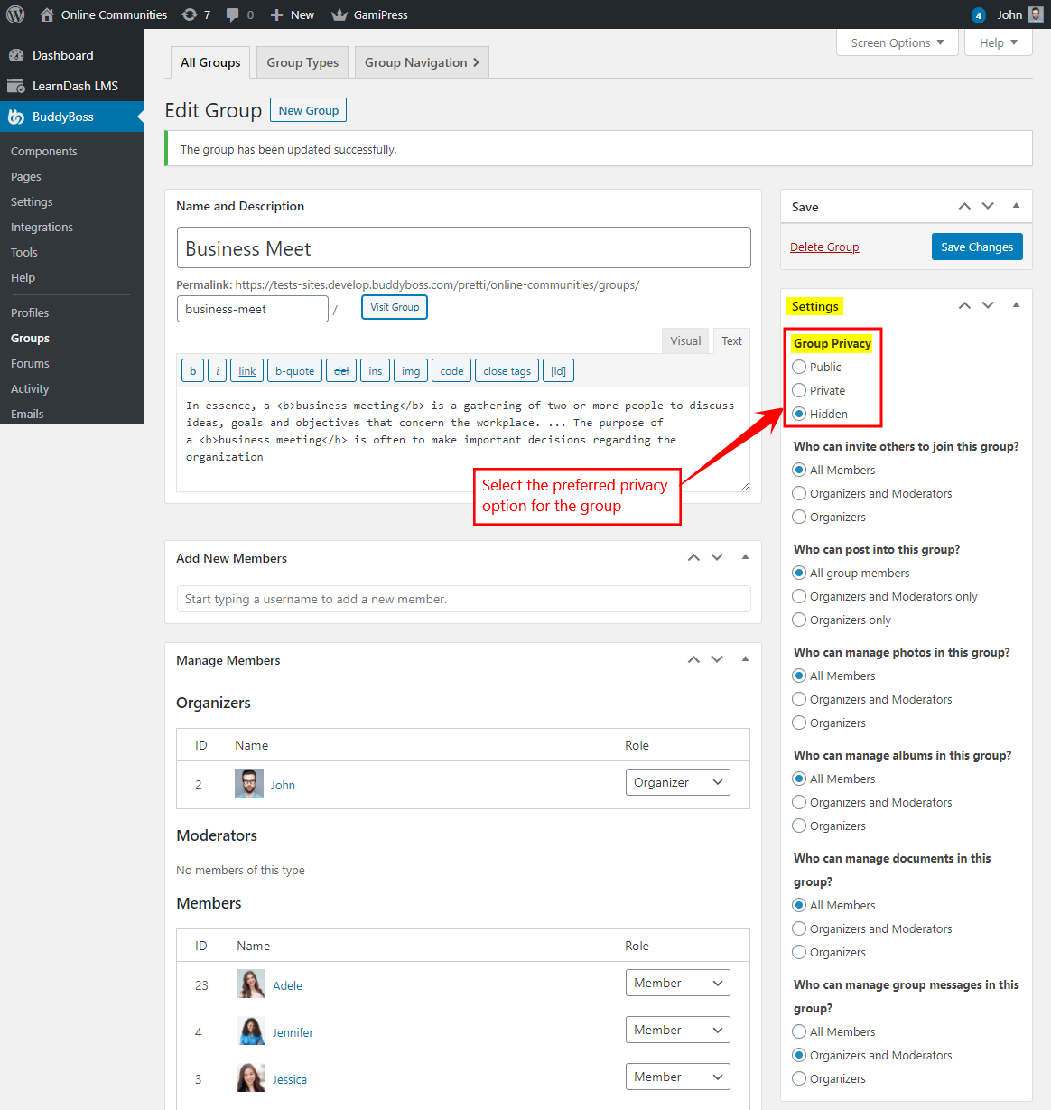 Lastly, we will select the Group Privacy as Hidden. And I think you won’t miss to press the Save Changes button.