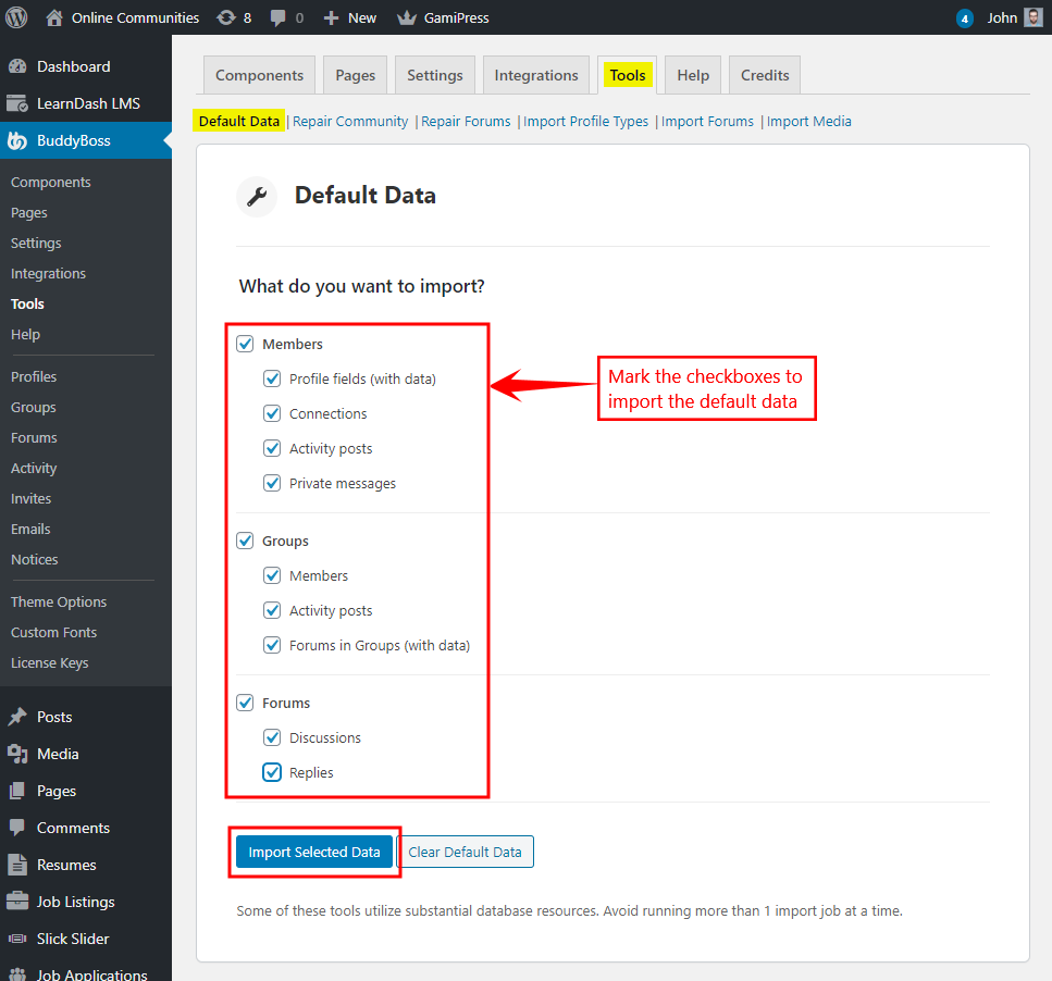 Now go to Tools and tick the box of Members, Groups, and Forums. Now click on the Import Selected Data button right below. With this you will have all the default data, you can now see how your BuddyBoss platform will look.