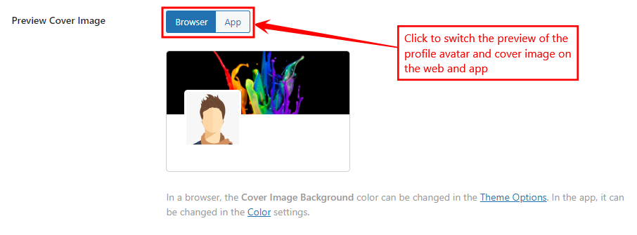 Let’s pick the BuddyBoss cover image. You can have the preview at the bottom of this setting. Right now we are watching the Browser preview. If you want to change the background color of the cover image then click on the Theme Options right below the preview section.