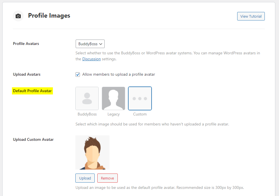 If you now select the BuddyBoss avatar system there a Default Profile Avatar section will appear. Choose the first BuddyBoss avatar and don’t forget to click the Save Settings button.